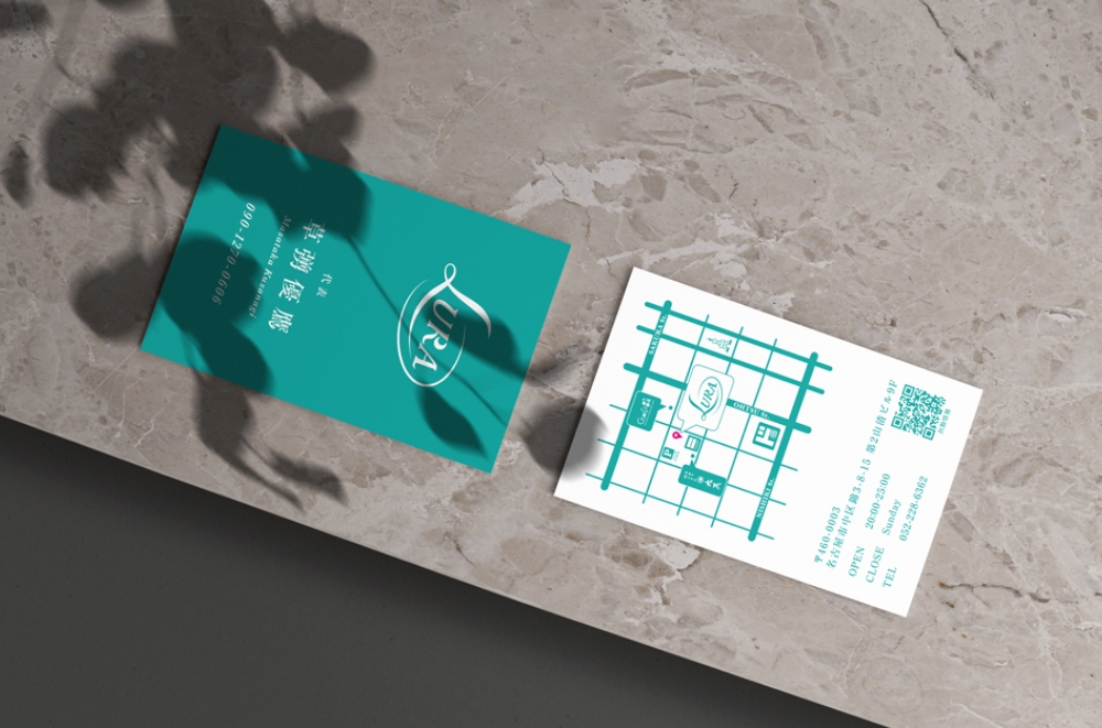 名刺デザインでは、ティファニーブルーを主体にしたカラーリングにより、清潔感と高級感を両立。余白を活かしたレイアウトによって、落ち着きと信頼感を表現しています。