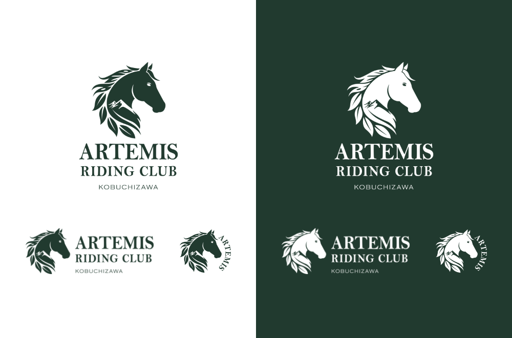 山梨県・小淵沢にある乗馬クラブ「アルテミスライディングクラブ小淵沢」のブランドロゴを制作しました。自然に囲まれたロケーションで提供する“乗馬体験・預託・レッスン”の価値を、ひと目で「上質さ」「安心感」「特別感」として伝えつつ、国内外の富裕層ファミリーに向けて通用する普遍的なアイコンへ落とし込むことが課題でした。