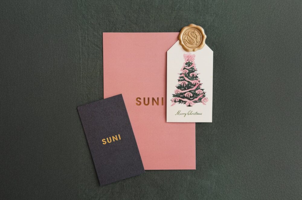 ブランドの第一印象は「ロゴ単体」ではなく、手元に届いた瞬間の“体験”で決まるため、ロゴ・巾着・カード類をバラバラに作らず、すべてを同一トーンで設計しました。ロゴは視認性と記憶性を優先し、余計な装飾を削ぎ落としたミニマルな構成に。巾着袋はベージュ系の柔らかなスウェードの質感を活かし、白のロゴで清潔感と上品さを両立させることで、商品を引き立てながらも“ブランドとしての格”が伝わるバランスに仕上げています。ショップカード/サンクスカードは、開封時のワクワクが途切れないよう情報量を絞り、余白・文字サイズ・紙の表情で高級感を演出。クリスマス販売でも季節限定感に寄せすぎず、次回以降の販売にも継続利用できる“普遍性のあるデザイン”に整えました。